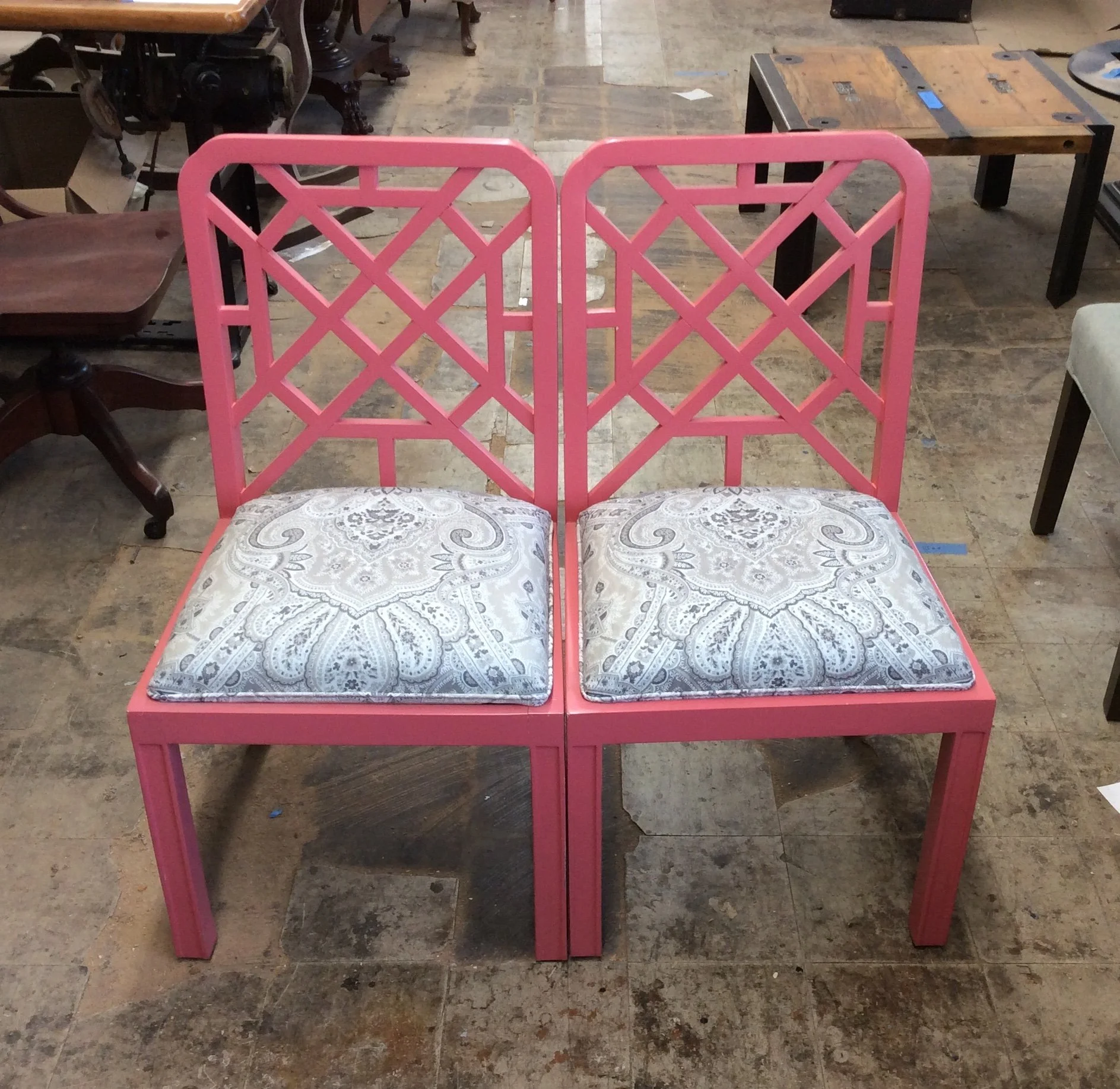Two unique chairs carved from solid wood, painted in a tasteful salmon, with seats covered in white fabric with a grey pattern. Professionally refinished and reupholstered, seats were recreated with new foam and fabric.